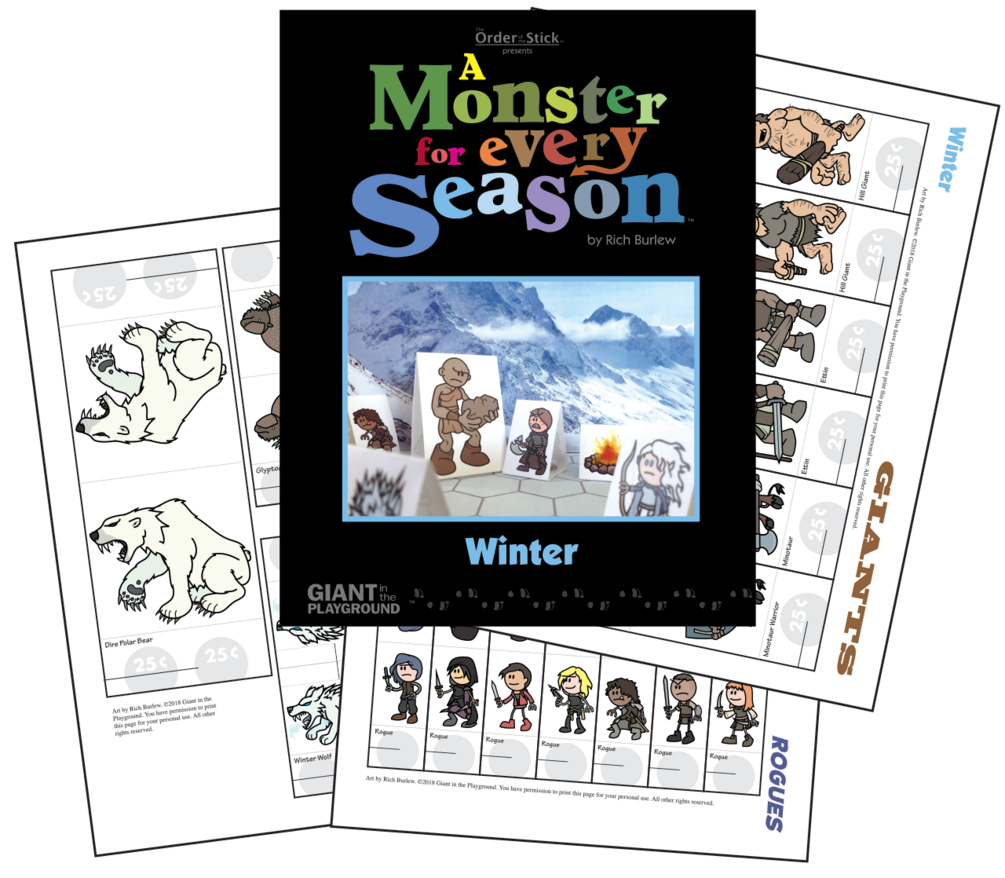 A Monster for Every Season is our line of print-and-play miniatures for your favorite tabletop fantasy roleplaying game. Each volume contains over 300 individual monsters to print, cut, fold, and tape a penny to—before springing them on your fellow gamers. Creatures are in scale to one another and to most metal gaming miniatures, and mounts can be folded so that that another figure can ride atop. You also get two complete files, one in full color and one in black-only line art to save toner (and allow you to customize coloration as desired).