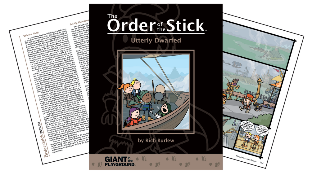 Here comes the sixth volume of The Order of the Stick, the fantasy-comedy webcomic that everyone agrees gets longer with each book released! In The Order of the Stick: Utterly Dwarfed, the Order is on their way north to save the world in style, thanks to their new friends on a cool pirate airship. Little do they suspect that while they deal with monsters and the usual plot stuff, one of their own is facing a battle inside their own mind! (It's Durkon, obviously.) And when the gods themselves start taking a closer interest in Roy's band of misfit heroes, this action-packed adventure ends up having repercussions so big, we couldn't fit them on the page! With almost five years of comics, this mammoth collection is our longest book yet (not counting the previous one). Here's what you'll find inside: